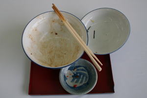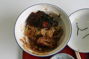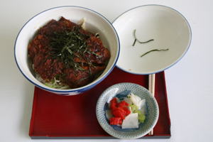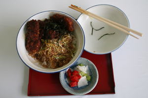 ご飯とトンカツの間にキャベツが入っています。いづみ茶屋のソースカツ丼。ご主人のおすすめ。そしてこのカツある工夫でとてもやわらかくできています。この工夫のおかげで、食べる人みんなが残さなくなったそうです。評判上々。もちろんソースも特製。秘密は写真下、真ん中にあります。一度食べてみてください。 | ||