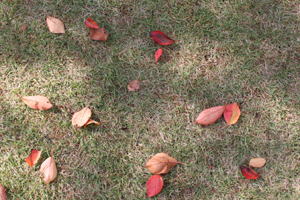 秋です。昨日の風で紅葉が。芝は乾きました。 | 陽があたり、色が映えます。 | |
