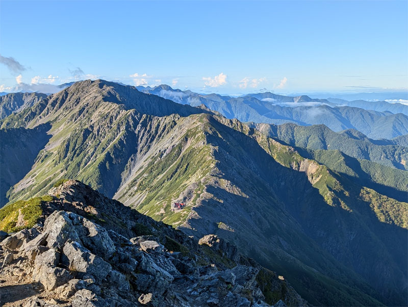 頂上から望む稜線の向こうは間ノ岳