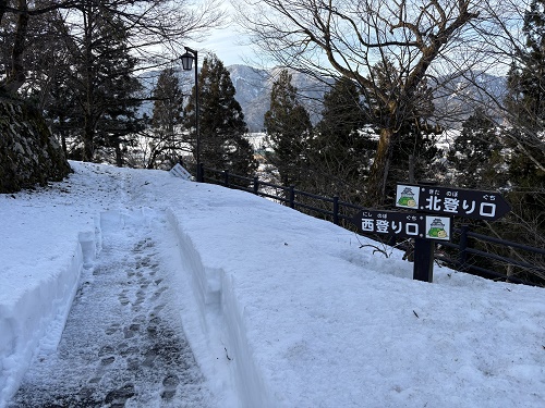 例年、3月も中旬に入る頃には観光客をはじめ大野市民の多くが家族での散歩、ウオーキング、ランニング、朝のラジオ体操等で賑わいを見せ始めるのですが、2月の大雪で遊歩道の除雪は始まったばかりです。