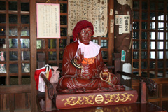 ご本尊は千手観音。奈良時代に高僧泰澄大師の作と伝えられます。 33年ごとのご開帳で、平成10年がその年にあたりました。 帆山寺は、いろいろな仏様が祭られており、本堂に入ったすぐ左手に安置されている涅槃仏や、「おびんずるさん」と呼ばれる撫で仏は自分の体の悪い部分と 同じところをなでると治るという。