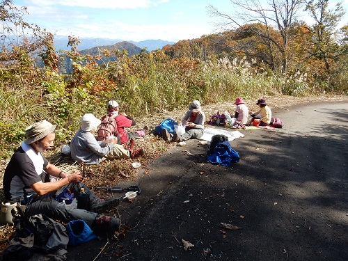 観光協会の職員さんからお味噌汁を振る舞って頂き、舗装された林道にシートを敷いて少し早目の昼食タイムです。