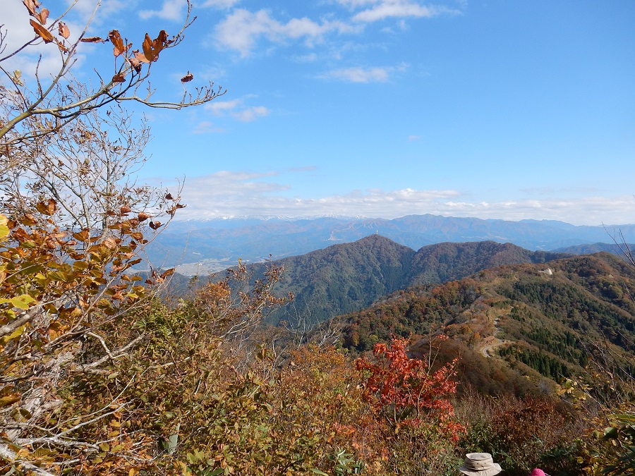 振り返って、薄く冠雪した白山、赤兎山、法恩寺山(スキージャム勝山)、中央に保田経ヶ岳、祝山からの稜線と大仏林道が一望出来ます。