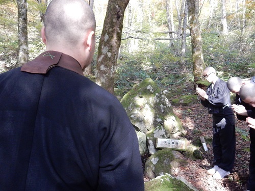 石仏の周りの折れ枝や落ち葉を掃き清め、道元禅師の法要の準備をします。